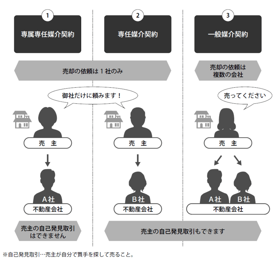 不動産売却の媒介契約には「専属専任媒介契約」「専任媒介契約」「一般媒介契約」の3種類があります(22ページ図4参照)。一般媒介契約では複数の不動産会社に依頼できますが、担当者の努力が期待でき、売主も買主を探すことができる点を考慮し、専任媒介契約をお勧めします。ただし、売主が買主を見つけた場合はペナルティなしで解約できることが前提となります。