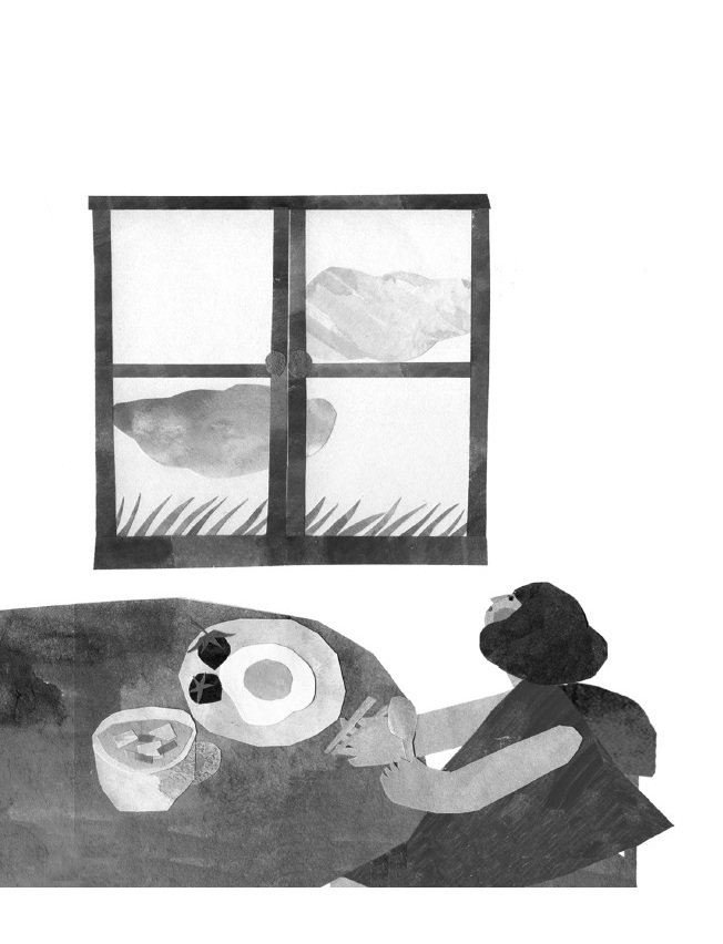 チーホは右手におはし、左手にスプーンを持(も)ったまま、前(まえ)に座っているおとうさんの後(うし)ろにある、窓(まど)の外の空をながめていた。