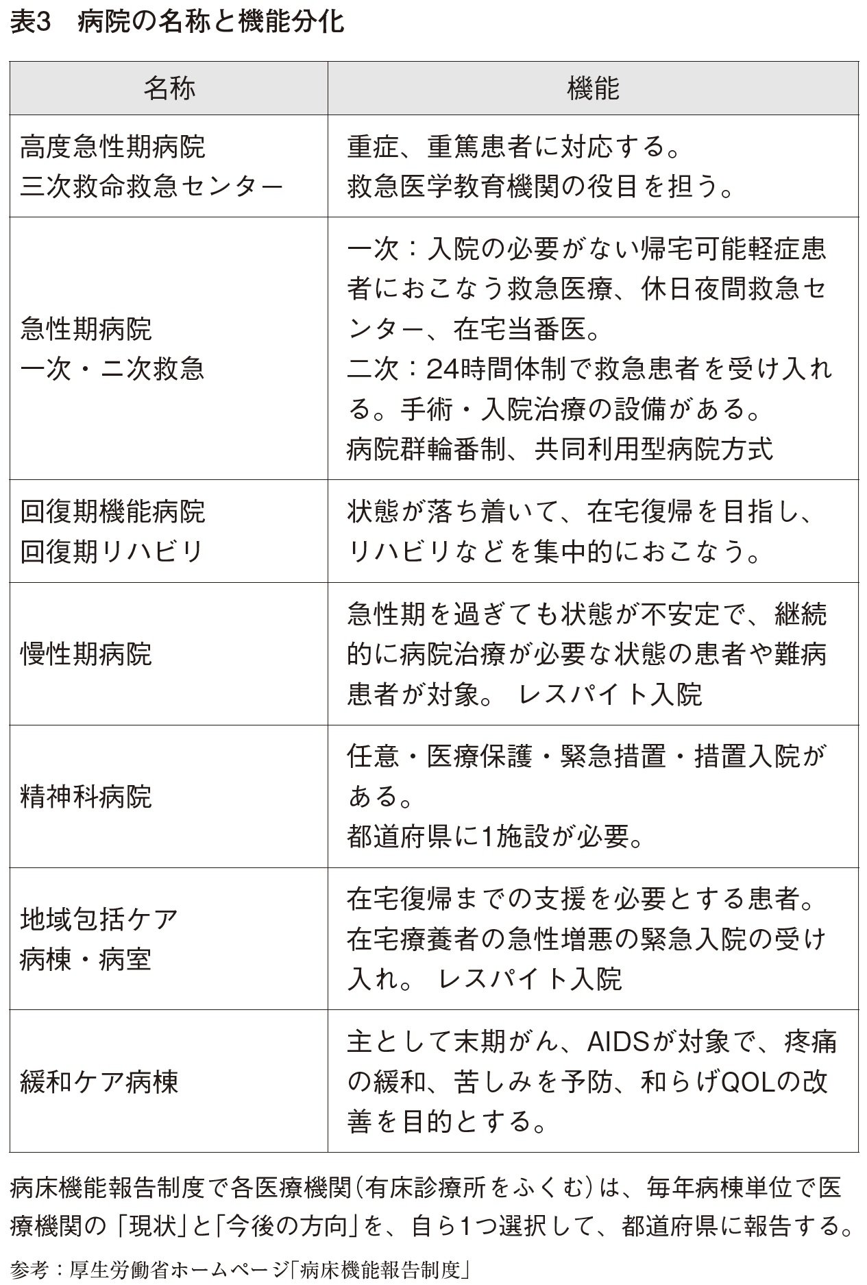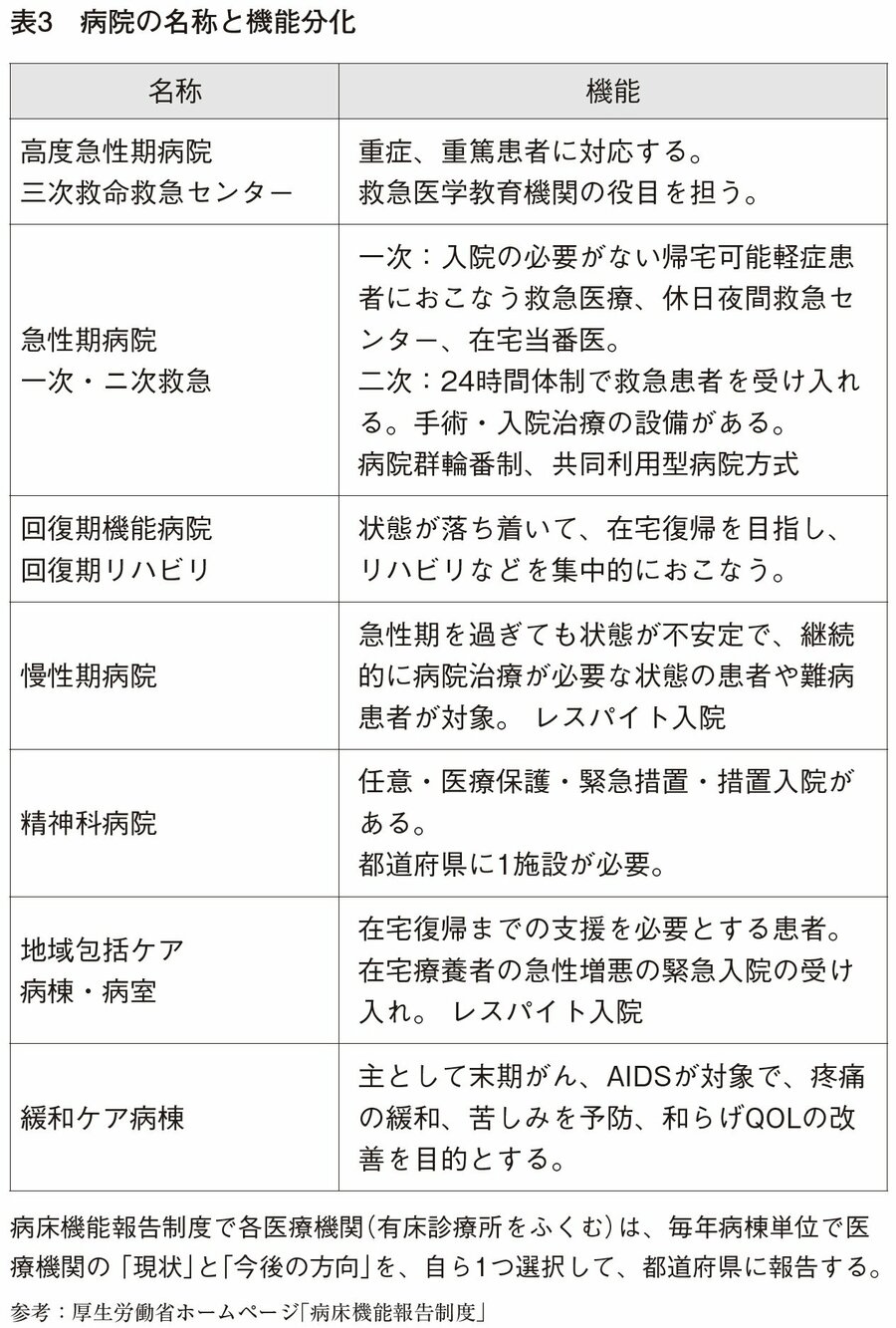 病院の機能分化推進を反映し、二〇一八年から、一般(1・2・3)、リハビリテーション、慢性期、精神科、緩和ケアの七機能種別に評価がおこなわれるようになった(表3)。