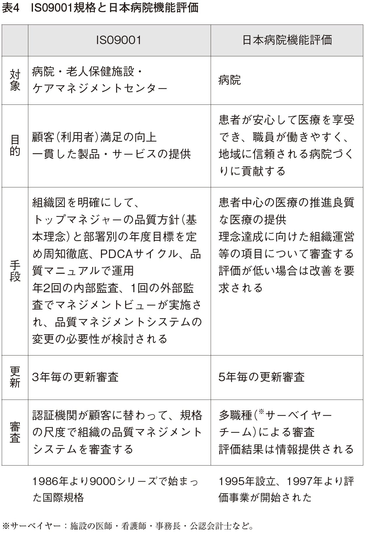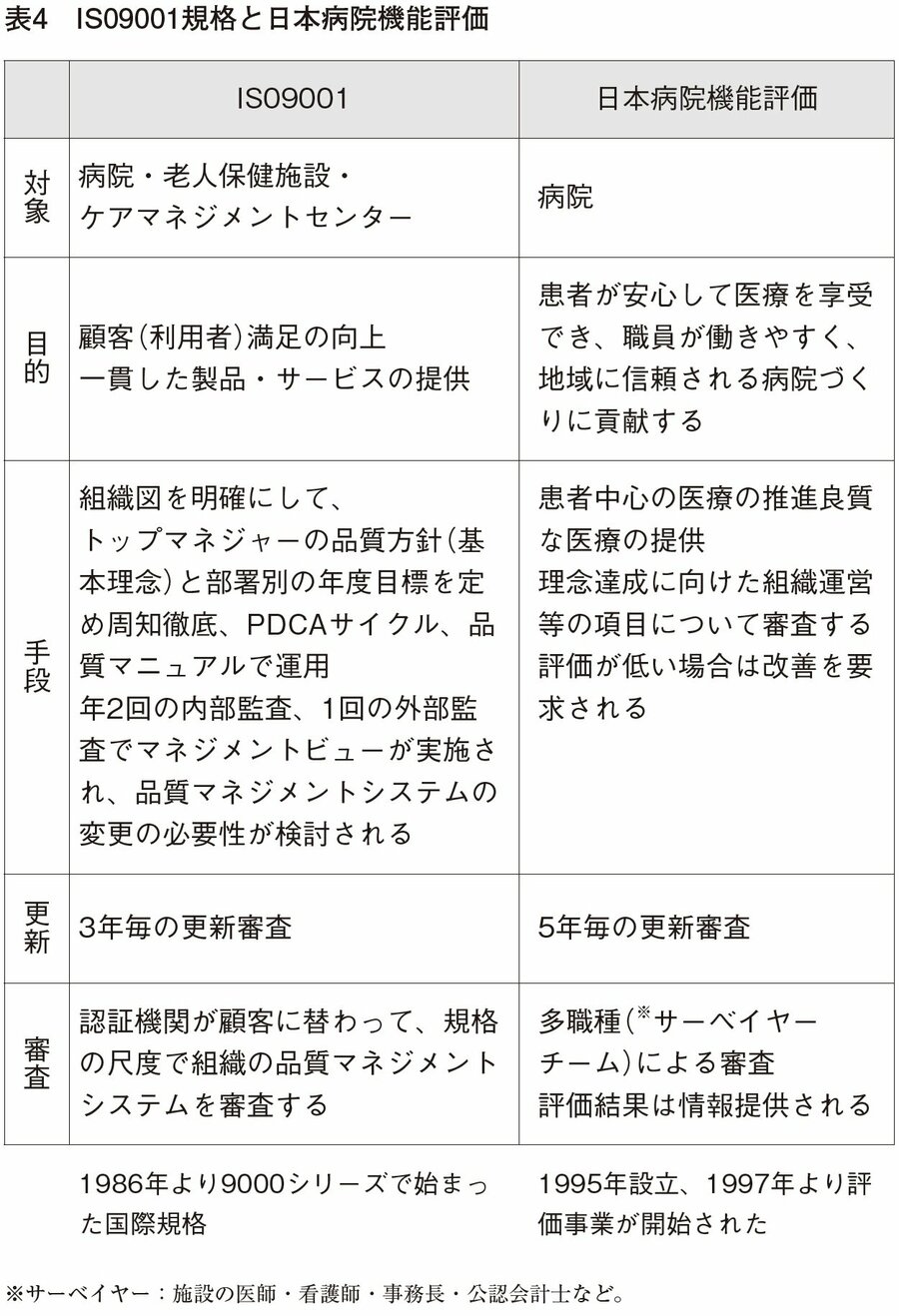 病院機能評価は病院の理念達成と、優れた医療の提供を支援するために設立され、多職種のサーベイヤーによって評価がおこなわれる。現在二千二百位の認定病院がある。ISOと異なり、病院のみが対象であるため、評価の対象となる組織図も病院部門だけである。