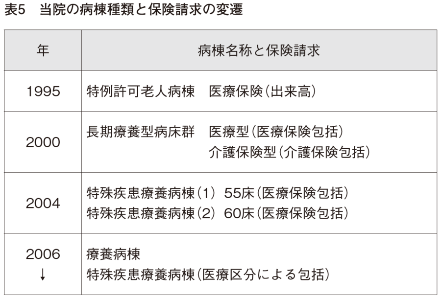 この時、主宰の先生方に療養病床の将来についてお尋ねしたところ、「重症患者を診ない病院は病院として認められないので、老健になる」と言われた。この言葉で当院の方針が決まり、介護保険型病床を中止し、全病棟を特殊疾患療養病棟にした(表5)。