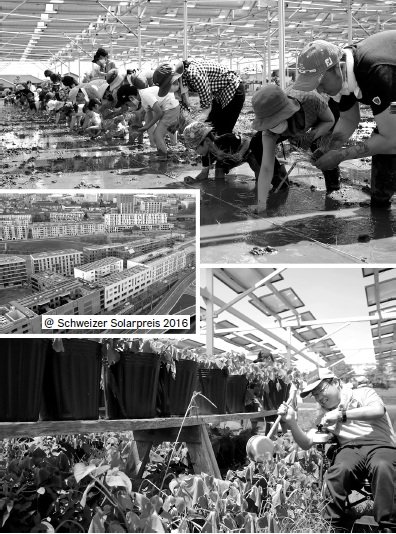 例えば、スイスの最大級の太陽光発電所・バーゼル市内エルマント東地区の建設共同組合式のものは、すべての屋根に合計850kWの発電所を作り、10棟400世帯に100%再エネの電・熱を供給している。