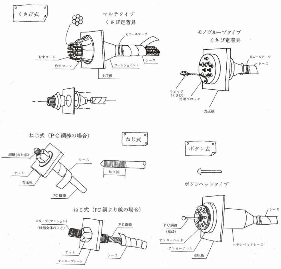 現在,ポストテンション方式で用いられる定着工法は24種類あり,くさび式,ボタン式,ねじ式,ループ式,合金式などに分類される.