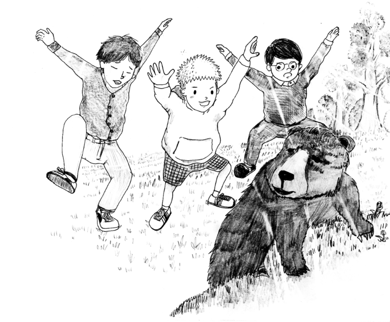 功を奏して、クマは、三勇士の気迫にたじろぎ、ひるがえって林の中へ去っていった。