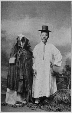 韓国の男性たちは、黒い馬の毛の付いた奇抜な透かし細工の帽子をかぶっており、それは彼らをとても背が高くてやせ型に見せ、おしゃれにしている。彼らが雄の子牛に乗っている時は、特におかしな格好に見える。