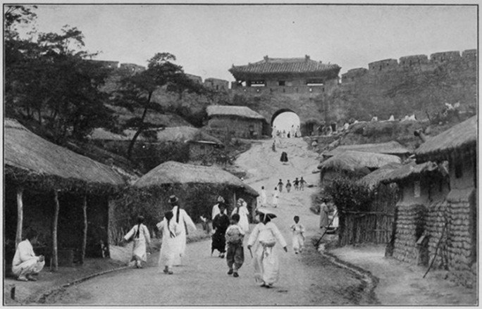 ソウルは白雪を被った美しい山々に囲まれた谷間に魅力的に位置し、山々を巡って、高い壁が市街を取り囲んでいる。古い入口の門は、がっしりした建物で、アーチがくり貫かれた巨大な石の土台の上に二重に反り返ったタイル張りの屋根が聳(そび)えている。汚物のある狭い路地の旧市街はほとんど姿を消していた。