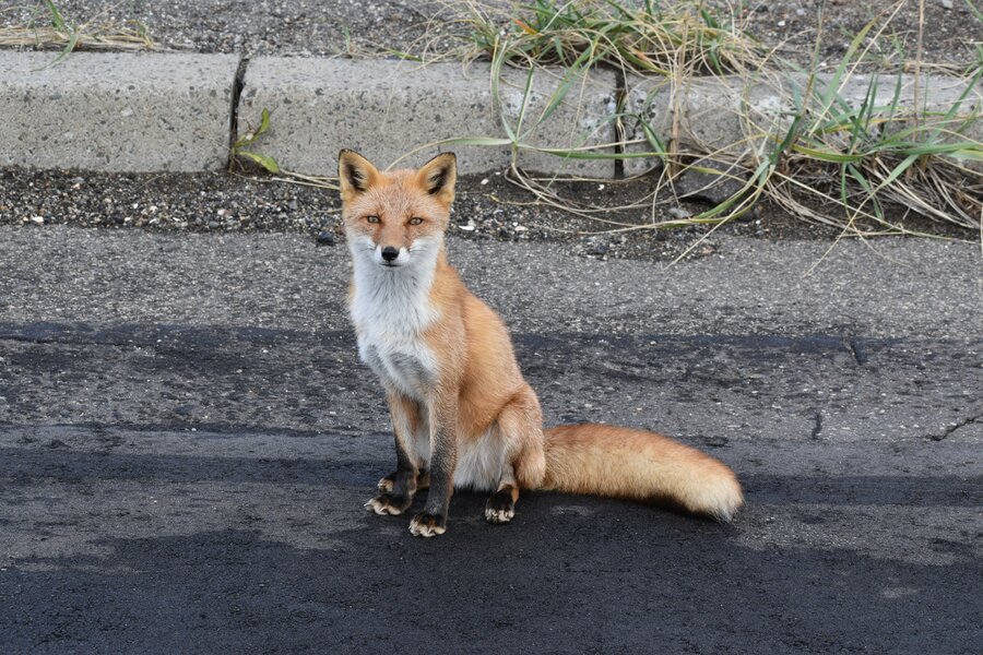 キタキツネは肉食なので草は関係なく、彼らは単に、荒地よりは歩きやすいアスファルトの道を移動しているのではないかと思っている。人間が作ったインフラをちゃっかり利用しているのではないかと。