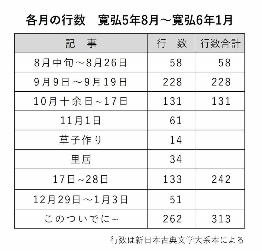 八月からの日記の行数を比較すると、十二月一月の日記の行数が少なかったことがわかる(表参照)。