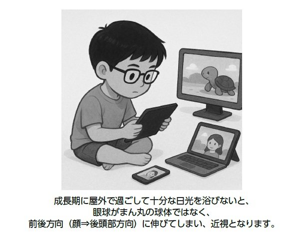 現在では、1日2時間以上の屋外活動をすることが近視予防に効果的とされています。