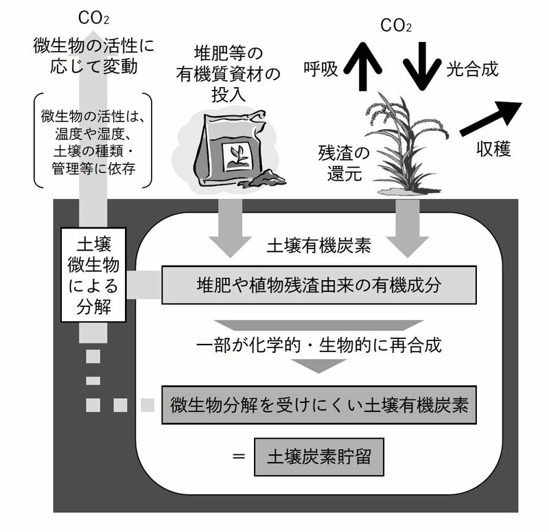水田や畑では、土壌炭素が増加すればその分、大気中のCO2を吸収したと考えることが出来る。従って、土壌炭素を増やすことによるCO2の吸収、つまり温暖化の緩和と、地力の維持増進による農地の生産力向上は、いわゆるWin-Winの関係にあり、土壌の炭素貯留を進めることは、生産にも環境にも良いということになる。