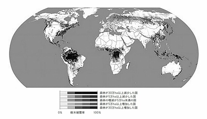 地球の表面積の約30%は陸地で、陸地の約30%が森林で、その面積は約38億7000万へクタ―ル(2000年現在)で日本の面積のおよそ100倍の広さである。世界の森林面積の年当たりの国別純変化量(2000年~ 2010年)を図1-3に示す。