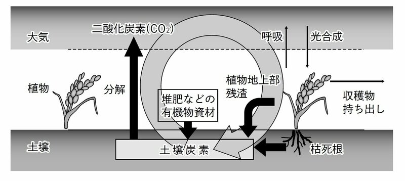 図1-4に示すように植生部分(作物体)の収穫物は持ち出されるので、土中に炭素は溜まることはないが、土壌に投入された堆肥などの有機物資材、植物地上部の残渣、及び枯死根は土壌有機炭素(SOC)として土壌に供給される。