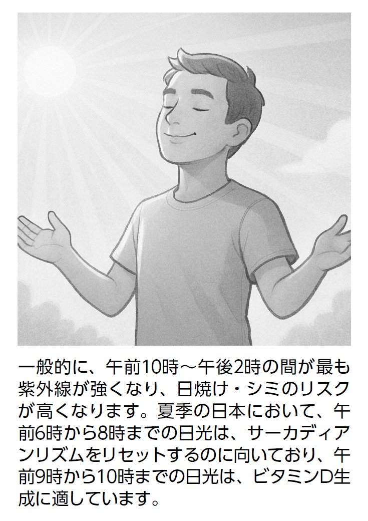 朝に日光(特に青色光を多く含む)を浴びることは、体内時計を「1日24時間」の周期に合わせる役割を果たします。朝、日光を浴びる時間は、15分から30分間程度が望ましいといわれています。朝の日光は、昼の日光に比べて紫外線が少なく、日焼けするリスクは低いのです。