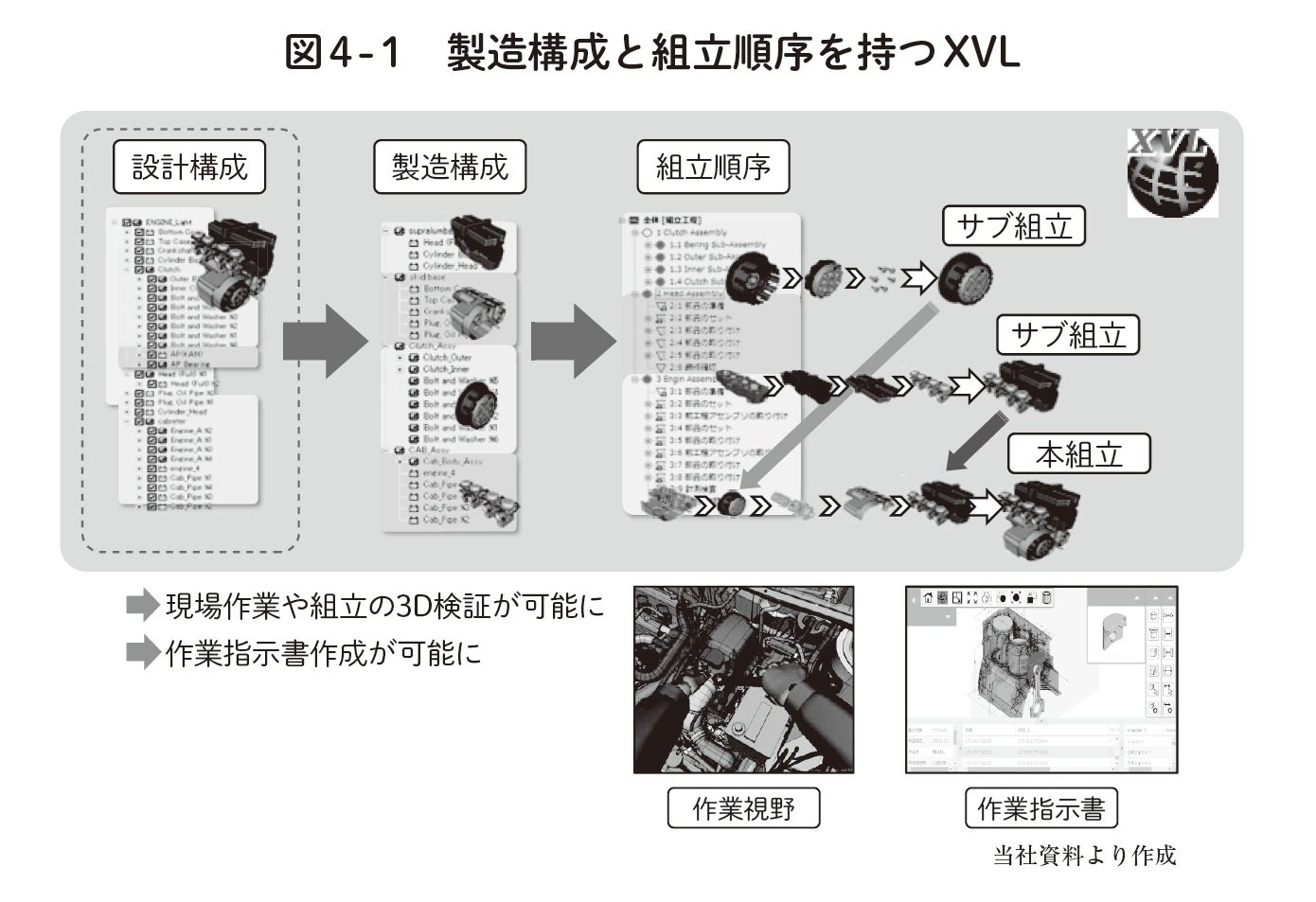 現場の方は自分が担当する作業工程の3Dモデルを見たいのであって、製品全体を表現した3Dモデルを見たいわけではなかったのだ。そこでXVLモデルを拡張し、3Dデジタルツインの中に製造構成と組立順序を表現できるようにした。