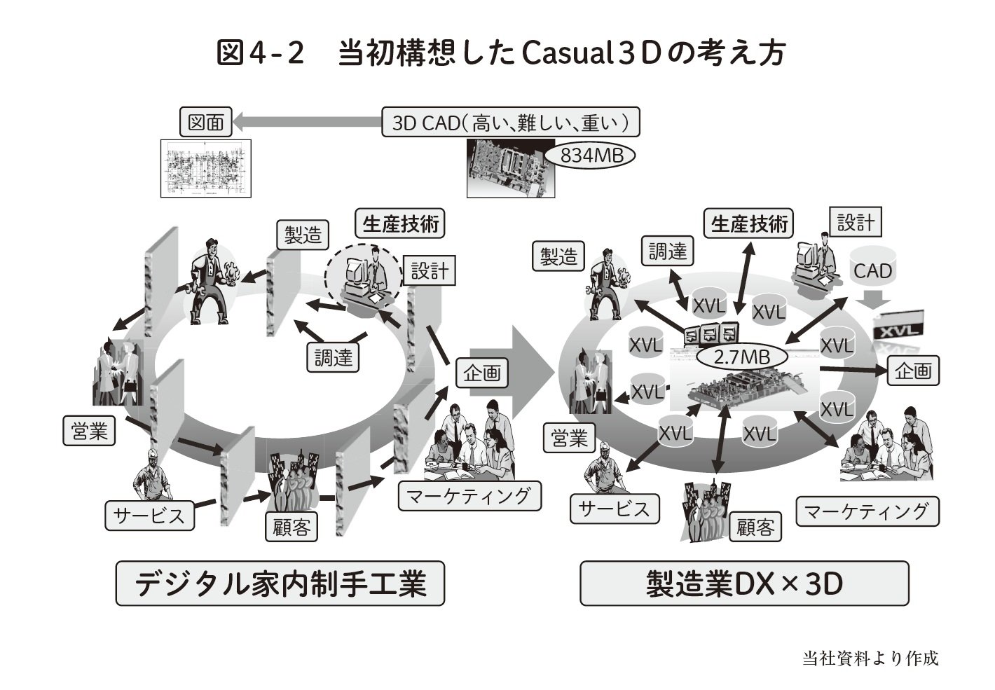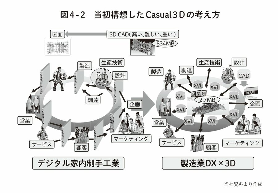もともと、軽量3DフォーマットXVLの開発は、2000年代初頭のインターネット時代が本格化する中で「いつでも、どこでも、だれでも3D」というCasual3Dのコンセプトを実現しようと始まった(図4-2)。