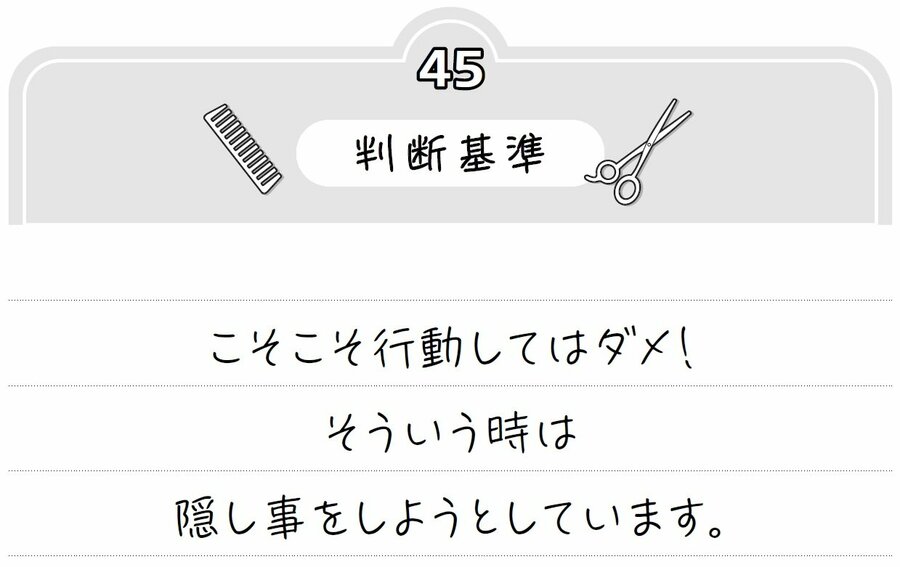 隠れて何かしようとしている時は、何か自分に後ろめたいことがあり、どうにかしてつじつまを合わせようとし、変な言い訳になり、余計に怪しくなって、結果どうにもならなくなり、ばれてしまいます。その時は一所懸命だが、後で考えると、とても幼稚でばかばかしいと思います。 堂々と出来ないことは、やめたほうが健康にも良いと思います。