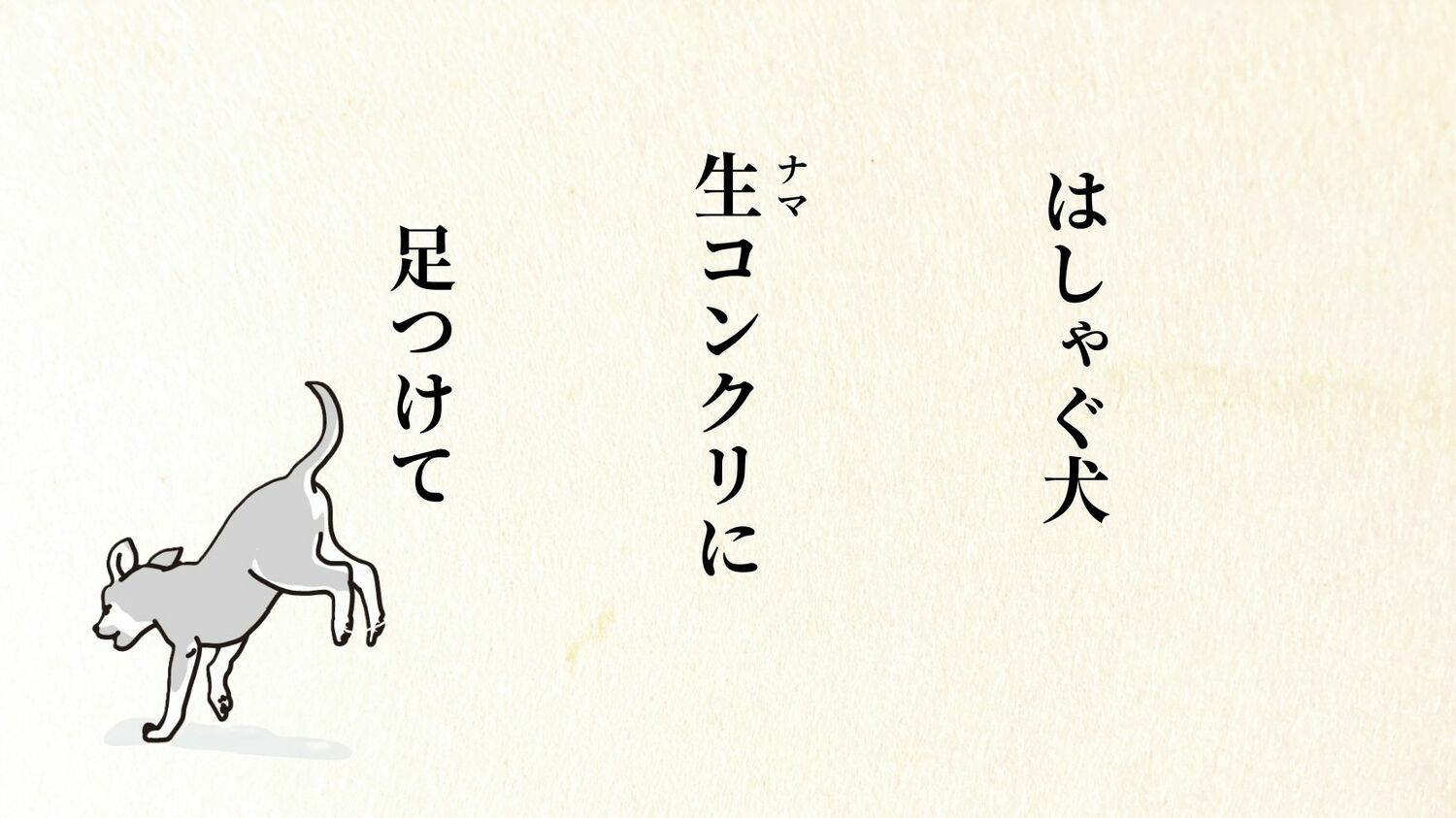 はしゃぐ犬 生(ナマ)コンクリに 足つけて