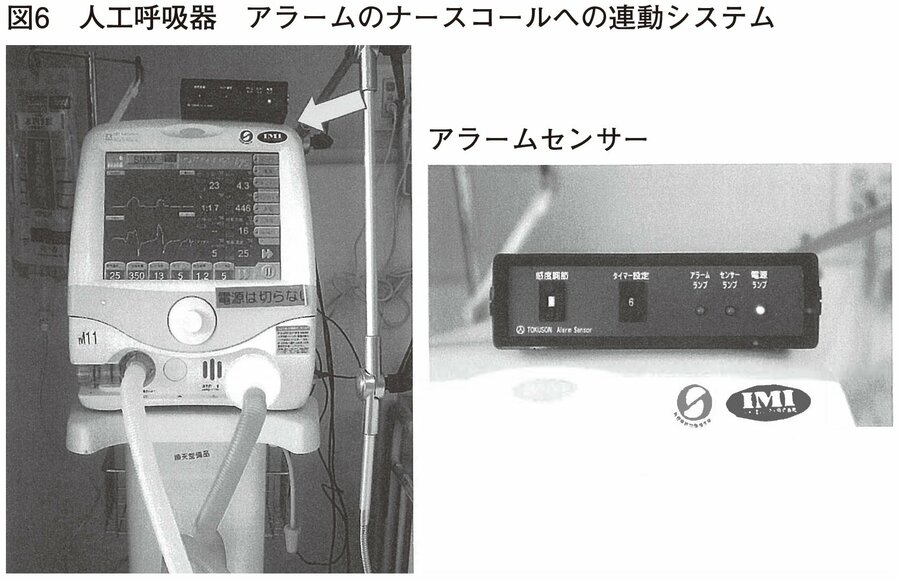 他施設の回路外れのアラームに看護師が対応できなかった報告から、感度変更が可能でアラームセンサーからナースステーションにコールされ、ピッチに連絡される装置を、日勤時はリーダーが、夜勤時には看護師全員が携帯している(図6)。