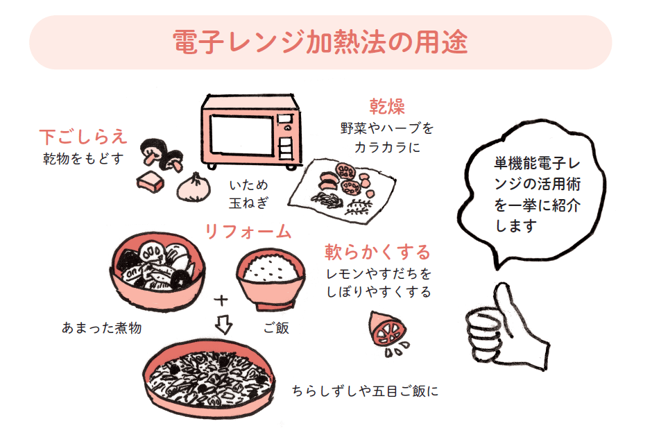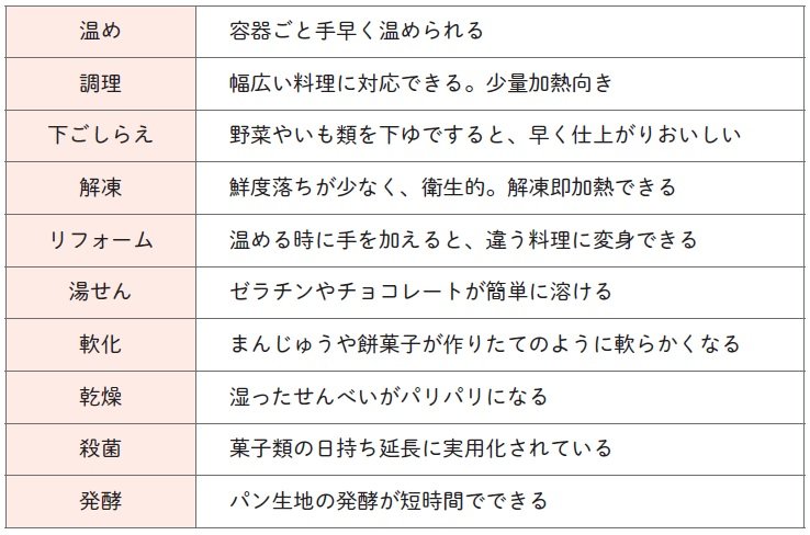 電子レンジの利用法をまとめると、温め、調理、下ごしらえ、解凍、リフォーム、湯せん、軟化、乾燥、殺菌、発酵の10項目にもなります(表参照)。