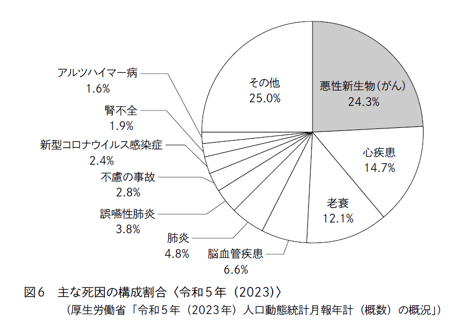 日本での死因は、1981年から心疾患、老衰、脳血管疾患、肺炎を抑えてがんが第1位で、死者数は増え続けています〈図6〉。
