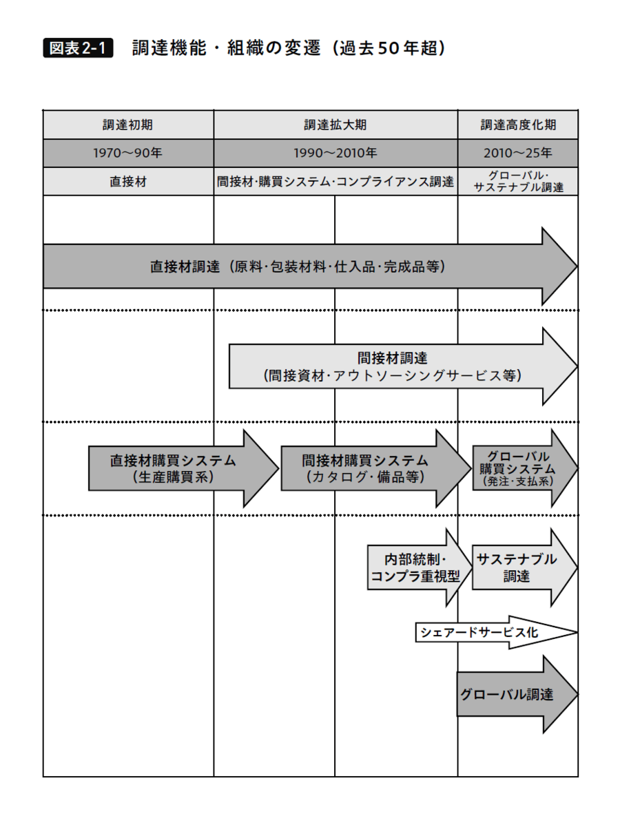 まずは、調達初期(1970~1990年)においては、メーカーでの原価に直接算入される直接材(原料、包装材料、完成品等)が重視され、生産部門内に専門性の高い人材が集められ、組織化されました。(図表2-1参照)