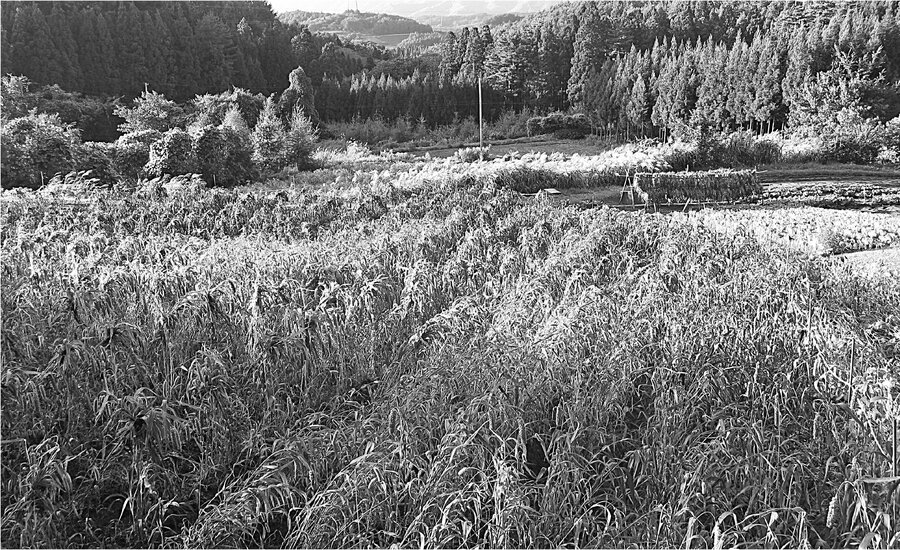 雑穀と出会った当初、僕はただただ雑穀地帯の原風景を求めて歩いた。山間を車で巡った。整然と区画された田んぼに稲穂がたれる日本らしい田園とは違う風景があった。穂は思い思いの方向にたれる雑穀は野性的で、原始的だった。そんな風景に出会うとわくわくした。