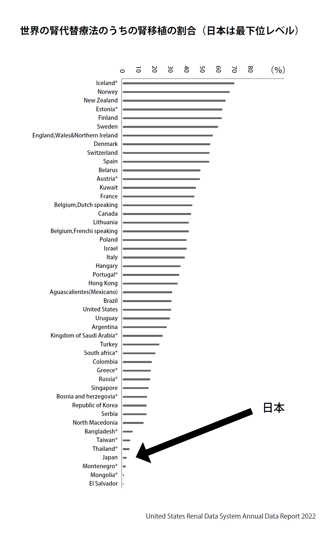 このような事情から、日本の透析患者の割合は世界で2番目に多いのですが、腎移植の割合は先進国でも最低レベルです(36・37ページの図)。患者の立場からすれば、腎代替療法の選択肢が限られていると言わざるを得ません。