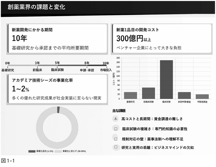 図1-1に、創薬から製薬までの道筋を示しました。研究成果がどのように社会に届くのか、直感的に理解できるように整理しています。