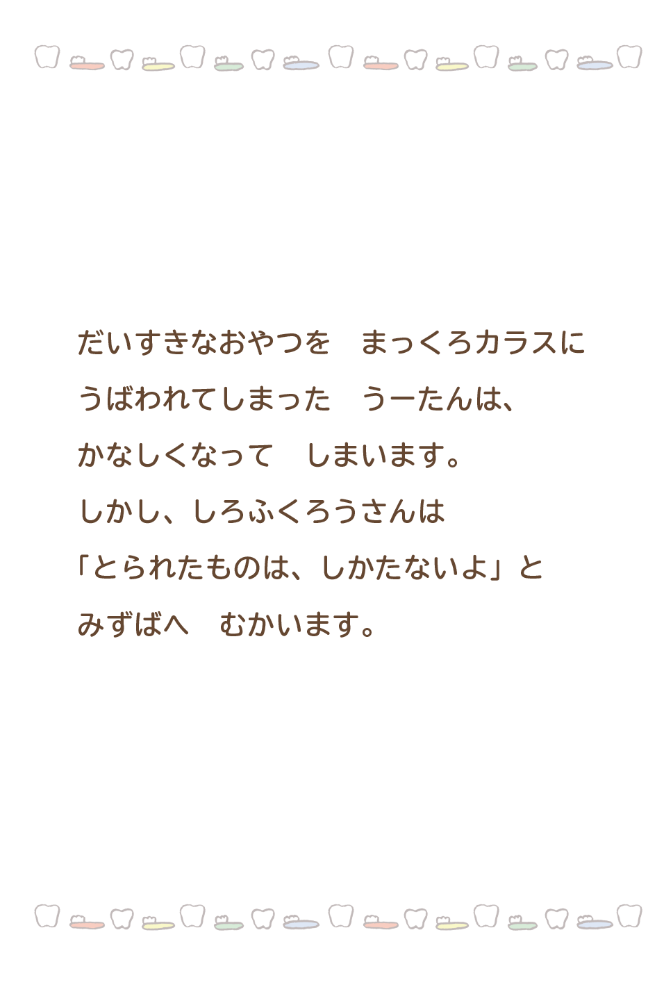 【絵本】しろふくろうさんたちは みずばで はみがきを しはじめました。「おやつを たべたあとは、はみがきを するんだよ」
