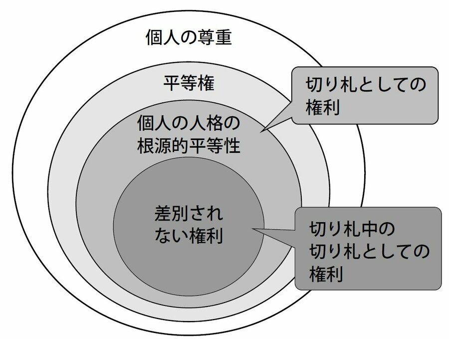 そして最も内側にある差別されない権利は、個人の人格の根源的平等性を体現する切り札中の切り札としての権利。