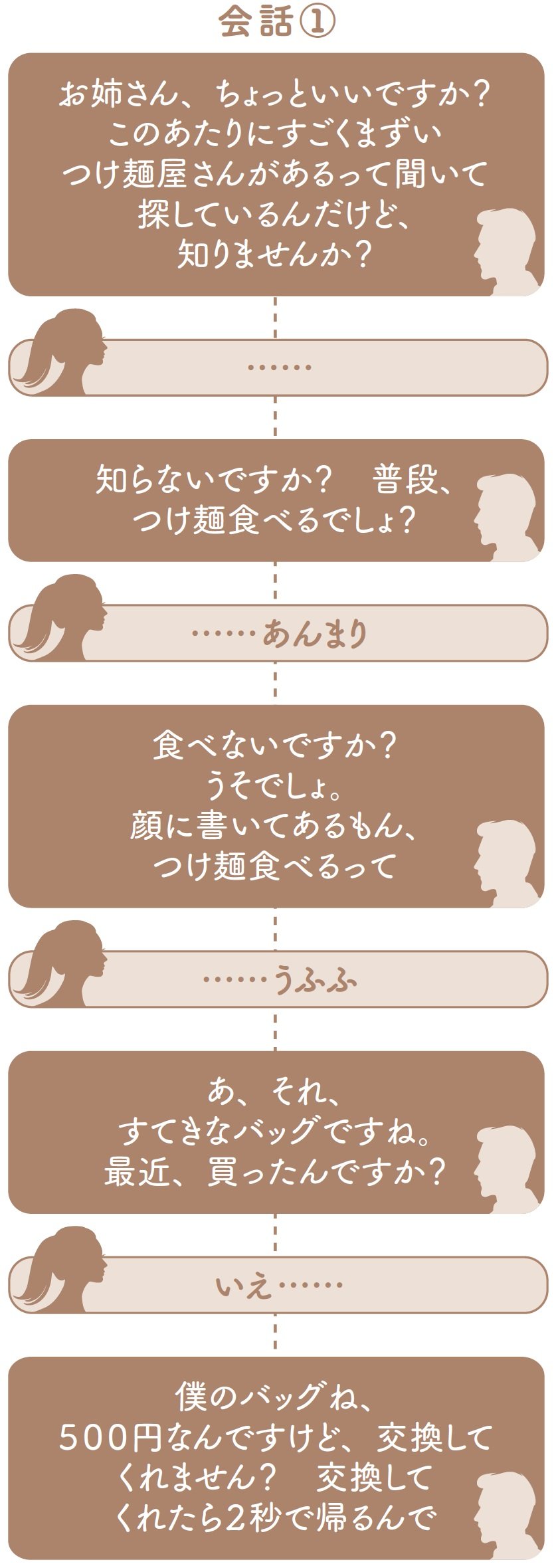 東京・池袋の路上。60代ほどの冴えない男性が、道を歩く20代前半とおぼしきミニスカート姿の女性に声をかけます。