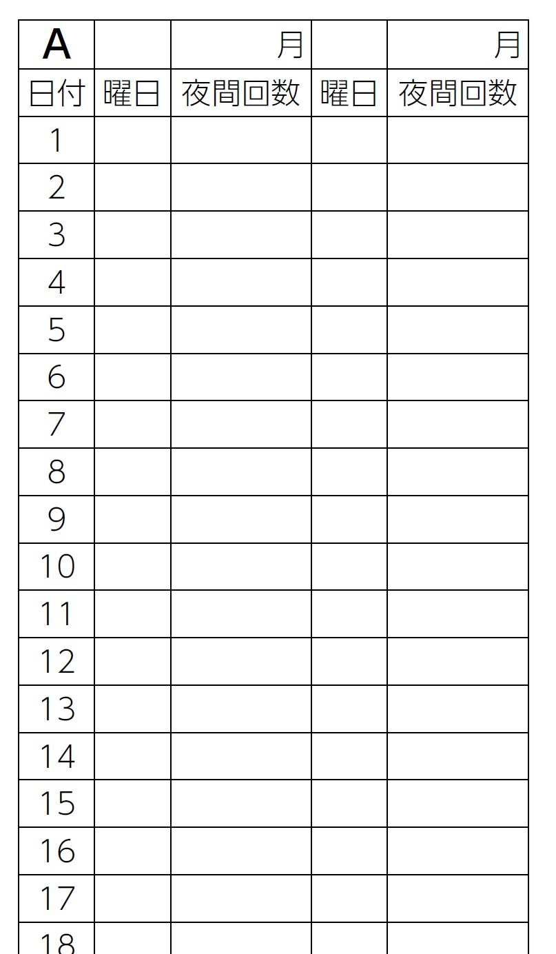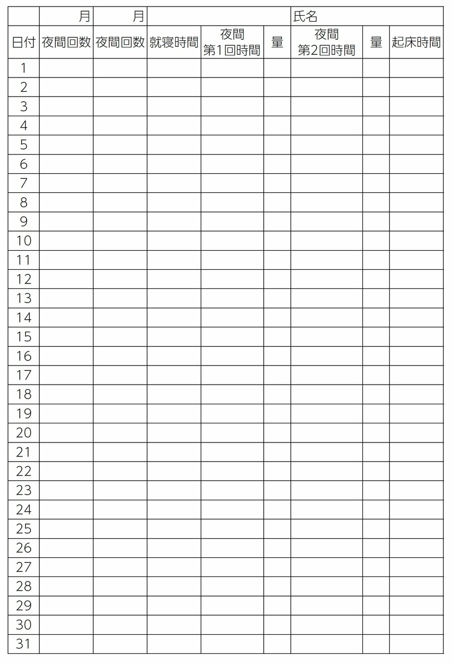 また、就眠時刻、1回目の排尿時刻を記載し、2回目以上があれば2回目だけの時刻記載だけで結構です。3回目以降の時間記録は省略します。