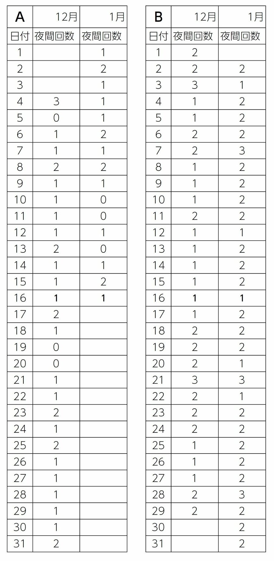 Bさんの最頻値は2回、平均夜間排尿回数:12月1・9回、1月2・0回でした。