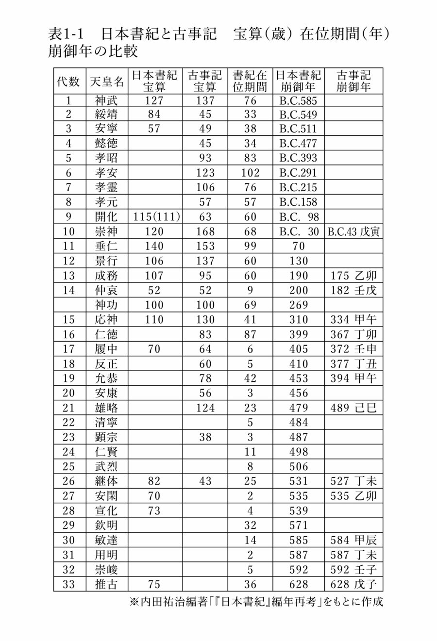 上古とは文献の存する限りで最も古い時代、大化の改新の頃までをいいます。表1-1では、上古の初期天皇群の中には異常な長命を記録したものが多数に上ることを見ました。各天皇の崩御年は、推古天皇の崩御年を始点として、各天皇の治世年数と空位年数を積み上げていくことで辿り着くものですから、年齢問題は結局は紀年の問題に還元されます。