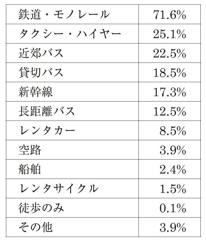 欧米やその他の地域からの観光客も順調に増加をしている状況です。訪日客が利用した主な交通機関として第1位に挙がるのが鉄道・モノレールで、2019年の7〜9月の統計では実に71.6%もの方が利用しているという記録が出ました(図2)。