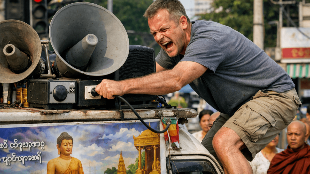 街宣車の大音量に耐えられず…車に上り、コンセントを引き抜いた外国人。あまりの大音量に我慢できなかったのか…
